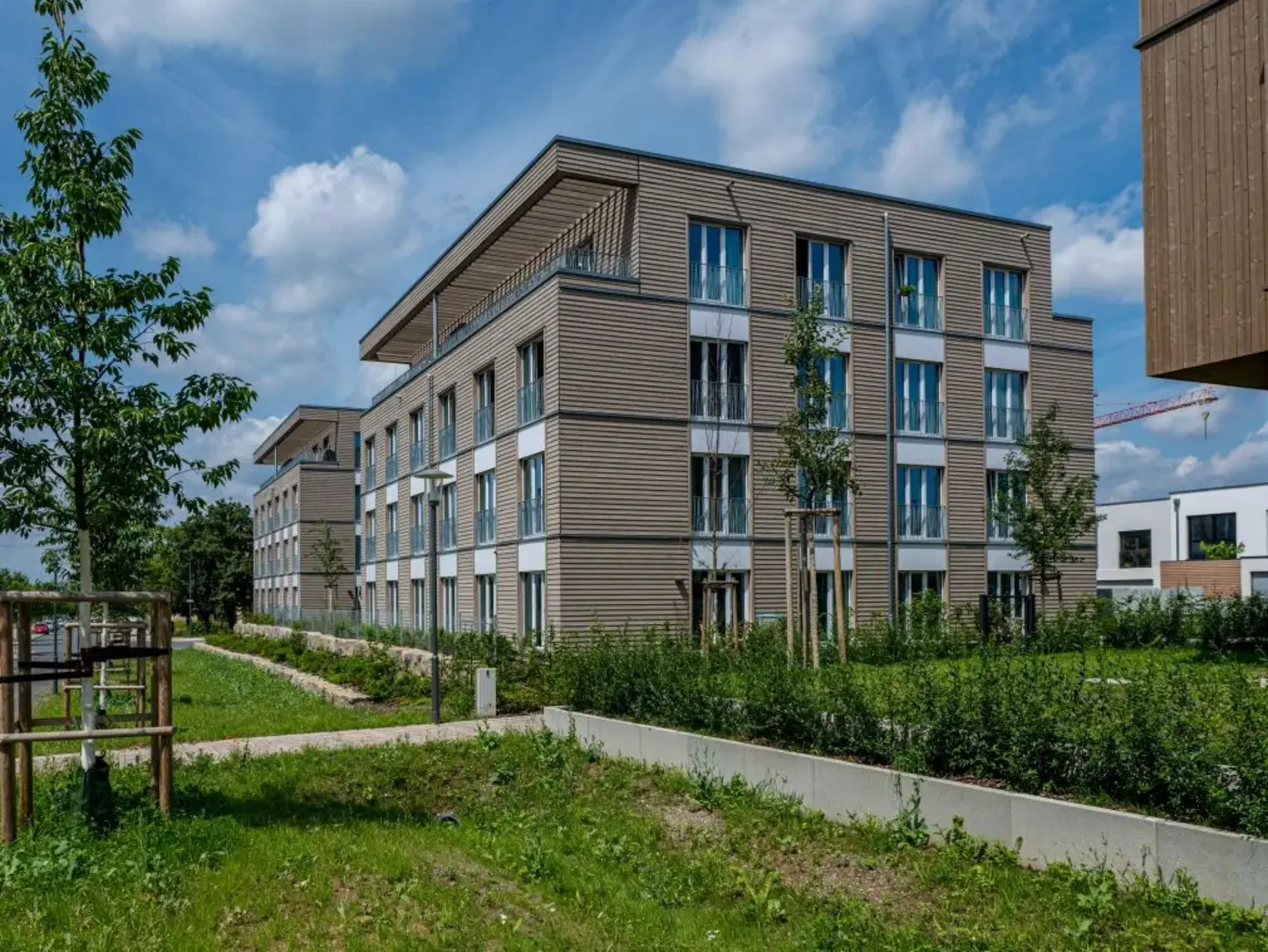 Der Neubau in Würzburg ermöglicht grünes Wohnen direkt im Grünen: Die 32 Wohnungen mit zwei bis drei Zimmern und einer Größe von 43 bis 92 Quadratmeter liegen am Rande des Hublandparks, der 2018 auf einer ehemaligen Militäranlage eröffnet wurde.  Durch die kompakte Bauart der Häuser haben alle Wohnungen ausreichende Tiefe, um Küchen und Bäder in ihrem Zentrum aufzunehmen. Bodentiefe Fenster leiten angenehmes Tageslicht in ihre Mitte.