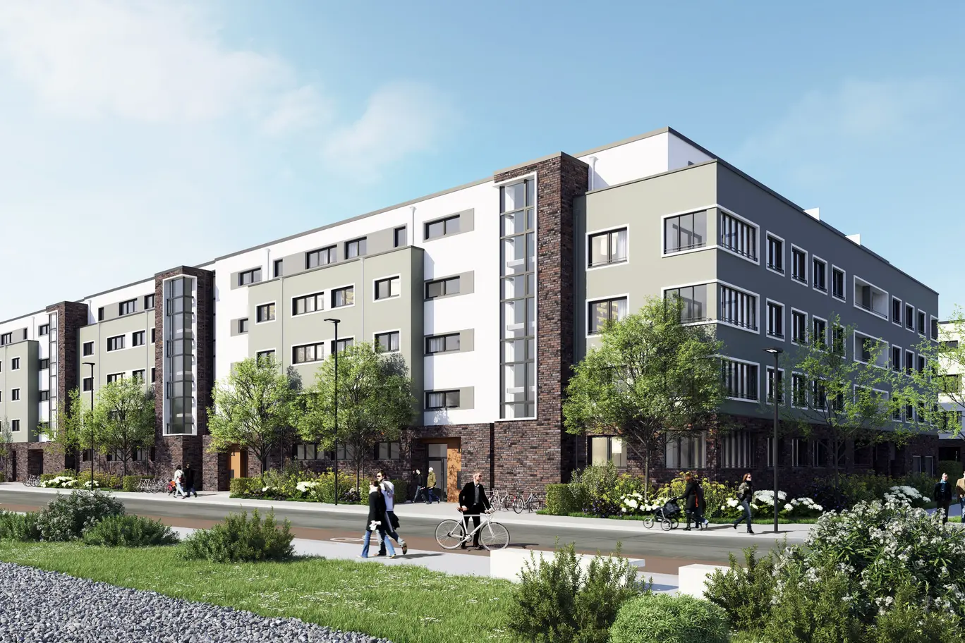 Das Wohnbauprojekt bietet neben den 156 Wohneinheiten auch einer Kindertagespflege Platz. Mit seinen vier Vollgeschossen und einem zurückgestaffelten Dachgeschoss zieht es sich als Blockrandbebauung entlang der Liebigstraße.